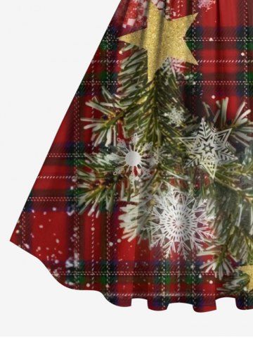 Plus Size Christmas Tree Snowflake Star Plaid Print Vintage Swing A Line Dress - Red - 3x