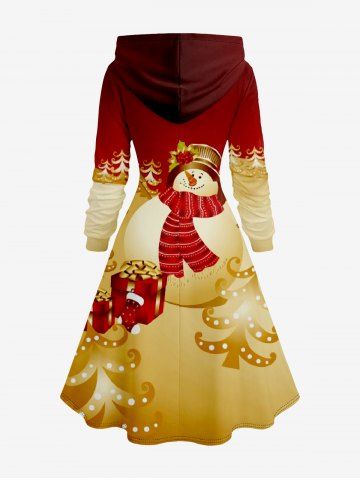 Plus Size Christmas Tree Snowman Gift Box Print Lace Up Drawstring Hoodie Dress - Red - 4x