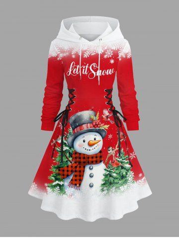 Plus Size Christmas Tree Snowman Snowflake Birds Print Drawstring Hoodie Dress - Red - S