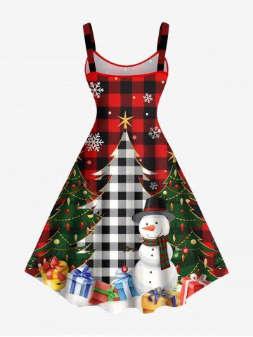 Plus Size Christmas Tree Snowman Snowflake Plaid Print Tank Dress - Red - 1x