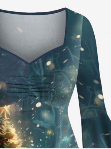 Plus Size Christmas Tree Snowman Star Gift Box Star Print Ruched Flare Sleeves High Low Dress - Green - 3x