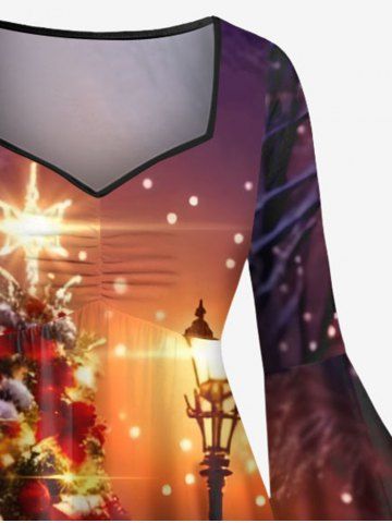 Dresses > Plus Size Christmas Tree Snowman Street Light Star Snowflake Print Ruched Flare Sleeve High Low Dress