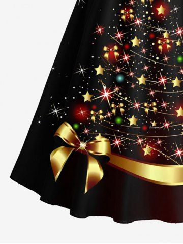 Plus Size Christmas Tree Star Bowknot Glitter 3D Print Scalloped V Neck Dress With A Belt - Black - 3xl