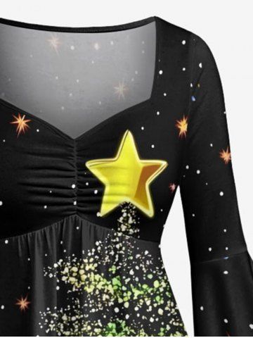 Plus Size Christmas Tree Star Galaxy Sparkling Sequin 3D Print Ruched Flare Sleeves High Low Dress - Black - 2x