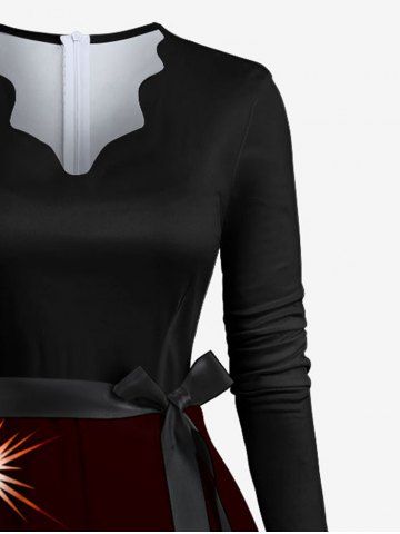 Plus Size Christmas Tree Star Light Beam Glitter 3D Print Scalloped V Neck Dress With A Belt - Black - 2xl