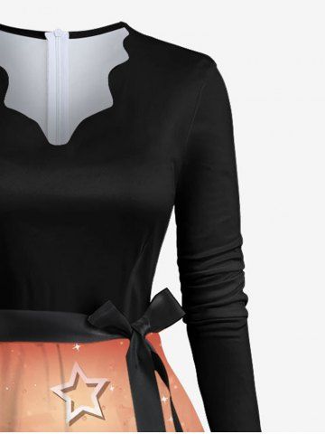 Plus Size Christmas Tree Star Snowflake Glitter 3D Print Scalloped V Neck Dress With A Belt - Black - 2xl