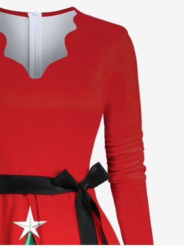 Plus Size Christmas Tree Star Snowflake Print Scalloped V Neck Dress With A Belt - Red - 2xl