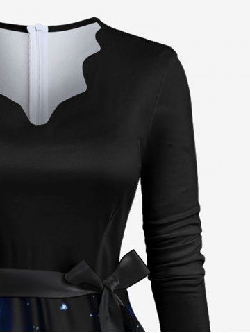 Plus Size Colorful Glitter Christmas Tree Cat Moon Galaxy Print Scalloped Neck A Line Dress with Removable Belt - Black - 2xl