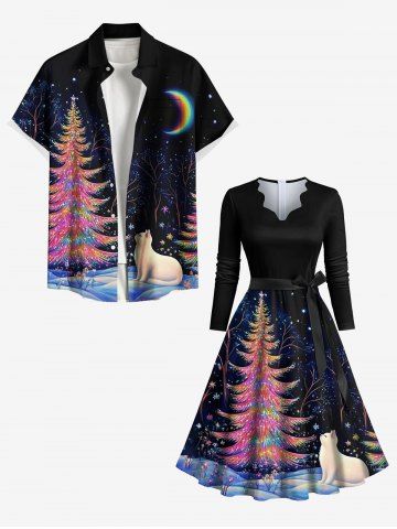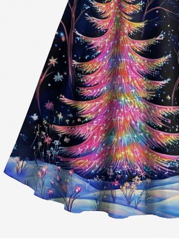Dresses > Plus Size Colorful Glitter Christmas Tree Cat Moon Galaxy Print Scalloped Neck A Line Dress with Removable Belt