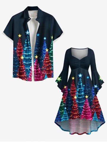Plus Size Colorful Glitter Christmas Tree Print Ruched High Low Asymmetric Dress - Navy Blue - 2x