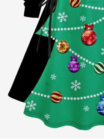 Plus Size Cosplay Christmas Tree Ball Snowflake Print Lace Up A Line Hooded Dress - Green - 4x