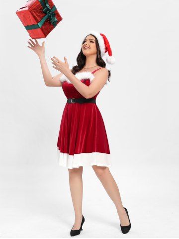 m*****e5Christmas Fuzzy Trim Bowknot Buckle Belt Two Tone Velvet Tank Dress and Velvet Crop Coat OutfitColor: REDLove this set, sooo festive! The cardigan can be used to pair with other Christmas dresses too to add a festive touch. The fabric is stretchy and roomy as well!