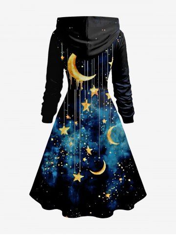Dresses > Plus Size Galaxy Moon Star Tassel Print Lace Up Drawstring Hoodie Dress