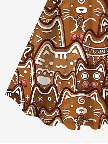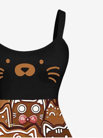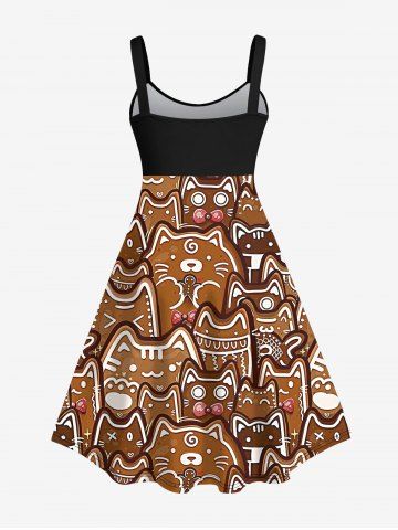 Plus Size Gingerbread Cat Bowknot Print Christmas A Line Tank Dress - Coffee - 3x