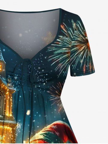 Plus Size Glitter Christmas Snowflake Castle Snowman Gift Fireworks Print Cinched A Line Dress - Deep Green - 5x