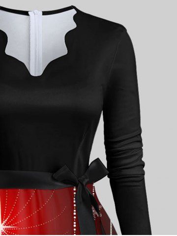 Plus Size Glitter Christmas Tree Ball Snowflake Print Ombre Scalloped Neck A Line Dress with Tied Belt - Black - Xl
