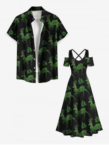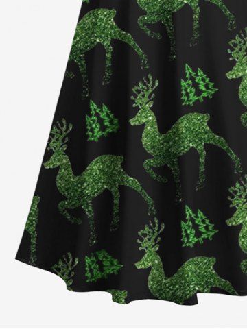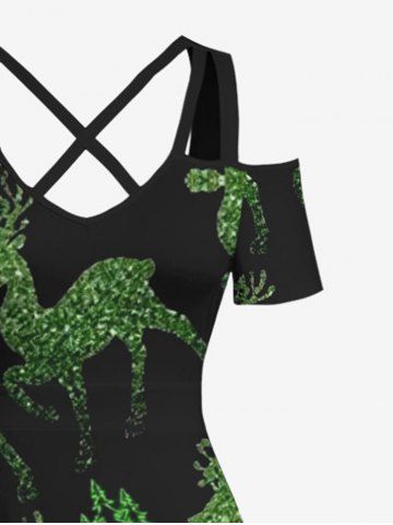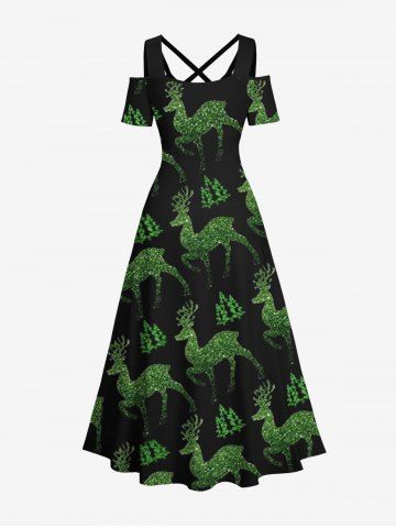Plus Size Glitter Christmas Tree Elk Print Cold Shoulder Crisscross A Line Maxi Dress - Black - 5x