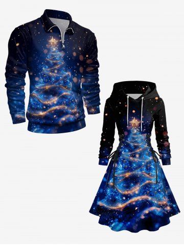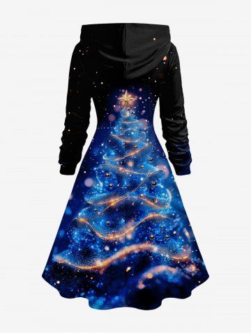 Dresses > Plus Size Glitter Christmas Tree Galaxy Print Lace Up A Line Hooded Dress