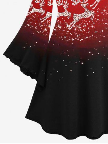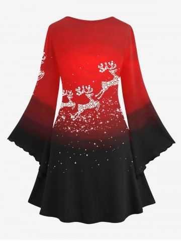 Plus Size Glitter Sparkling Elk Galaxy Print Flare Sleeves Ombre A Line Christmas Dress - Red - 1x