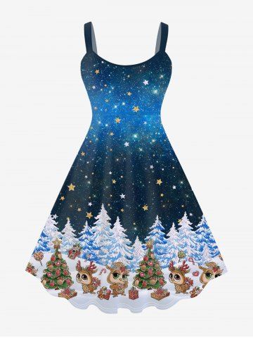 Plus Size Glitter Sparkling Galaxy Stars Christmas Tree Squirrel Gift Box Print A Line Tank Dress - Deep Blue - 1x