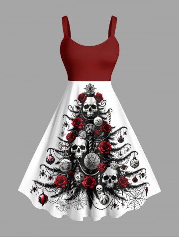 Plus Size Skull Rose Flower Spider Web Christmas Tree Ball Print A Line Dress - White - S