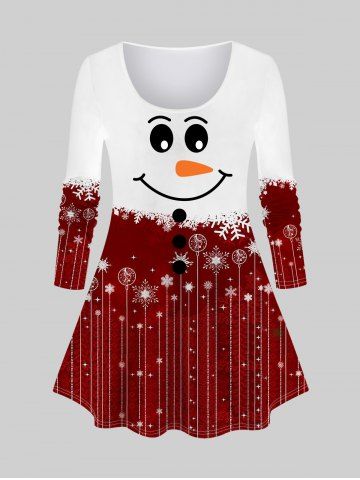 Plus Size 3D Glitter Snowman Snowflake Buttons Print Christmas Long Sleeves T-shirt - Deep Red - 3x