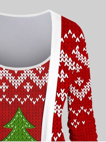 Plus Size 3D Heart Striped Christmas Tree Letters Ribbed Print Asymmetric Patchwork 2 in 1 Long Sleeves T-shirt - Red - 2x