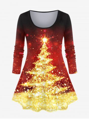 Plus Size 3D Sparkles Christmas Tree Printed Ombre Long Sleeves Tee - Red - 2x | Us 18-20