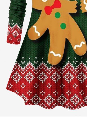 Plus Size Christmas 3D Textured Knit Gingerbread Print Long Sleeves T-shirt - Red - 5x