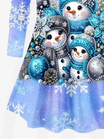 Plus Size Christmas Ball Flower Snowman Hat Scarf Snowflake Print T-shirt - Light Blue - 3x