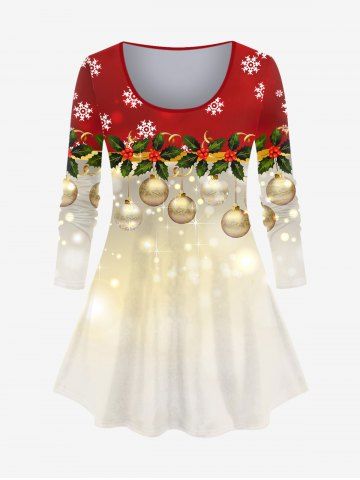 Plus Size Christmas Ball Leaf Snowflake Glitter Colorblock Print T-shirt - Red - 3x