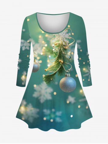 Plus Size Christmas Ball Light Snowflake Glitter 3D Print Long Sleeve T-shirt - Light Green - 4x
