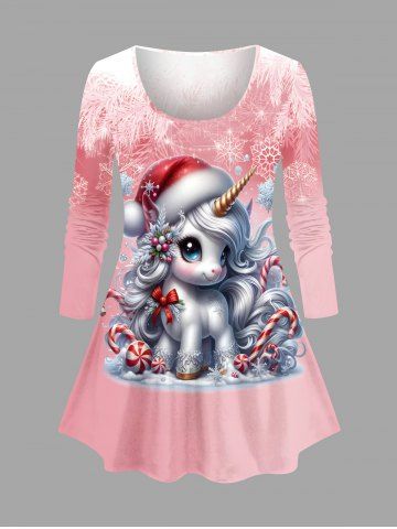 Plus Size Christmas Ball Snowflake Hat Unicorn Candy Print Long Sleeves T-shirt - Light Pink - 5x