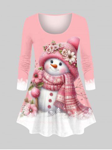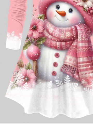 Plus Size Christmas Ball Snowman Flowers Snowflake Colorblock Print T-shirt - Light Pink - 5x