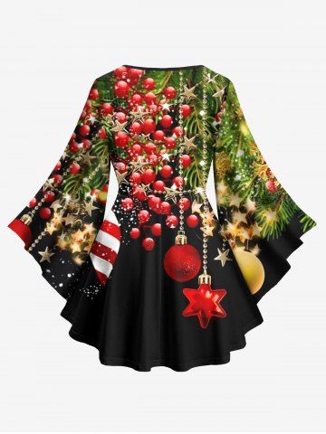 Plus Size Christmas Ball Stars Leaf Print Long Sleeves Lattice T-shirt - Black - 3x