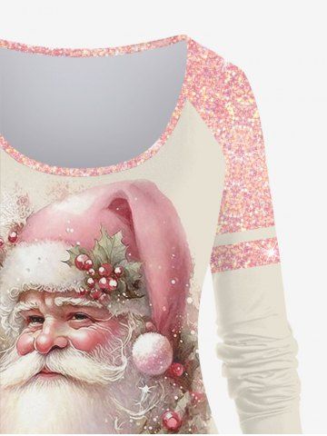 Plus Size Christmas Colorblock Santa Clause Snowflake Sparkling Sequin Glitter 3D Print Raglan Sleeve T-shirt - Light Pink - 4x