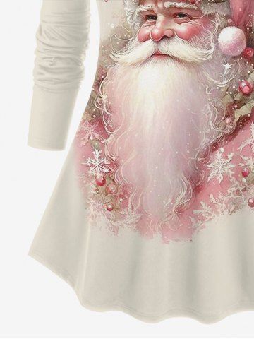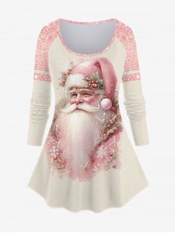 Plus Size Christmas Colorblock Santa Clause Snowflake Sparkling Sequin Glitter 3D Print Raglan Sleeve T-shirt - Light Pink - 5x
