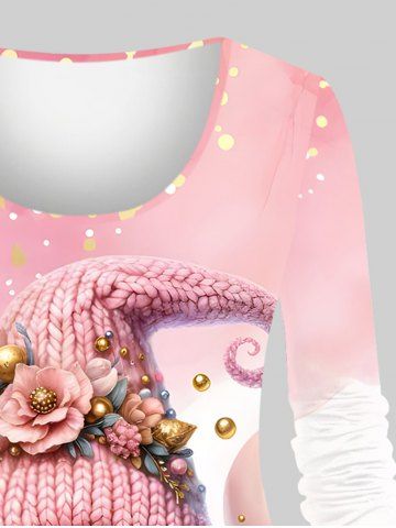Plus Size Christmas Dwarf Floral Hat Bear Balloon Print Ombre Long Sleeves T-shirt - Light Pink - 4x