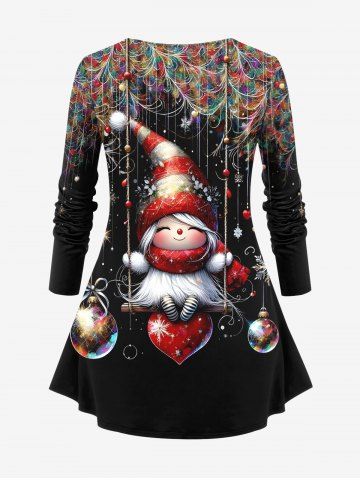Plus Size Christmas Elf Ball Heart Swing Colorful Feather Print Long Sleeves Women T-shirt - Black - L