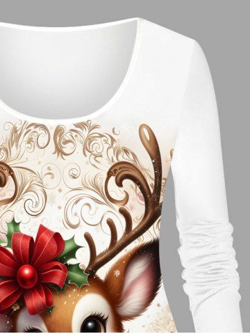 Plus Size Christmas Elk Bowknot Flowers Holly Fruit Print Long Sleeves T-shirt - White - 6x