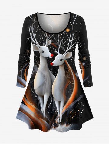 Plus Size Christmas Elk Light Beam Glitter 3D Print Long Sleeves T-shirt - Black - Xs