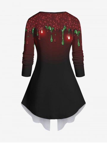 Plus Size Christmas Elk Plaid Sparkling Sequin 3D Print 2 In 1 Long Sleeves T-shirt - Red - 2x