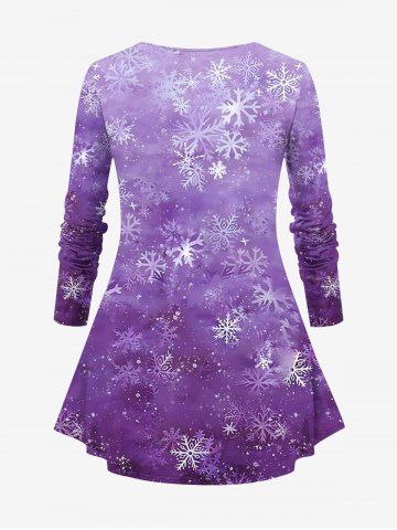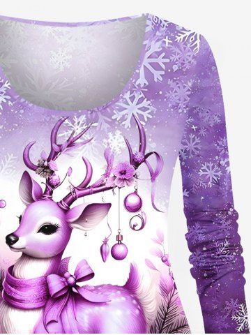 Plus Size Christmas Elk Snowflake Bell Bowknot Floral Print Ombre Long Sleeves T-shirt - Purple - 4x