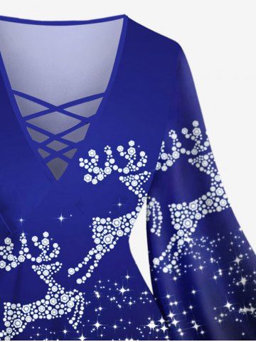Plus Size Christmas Elk Star Glitter 3D Print Lattice Crisscross Flare Sleeve T-shirt - Midnight Blue - L