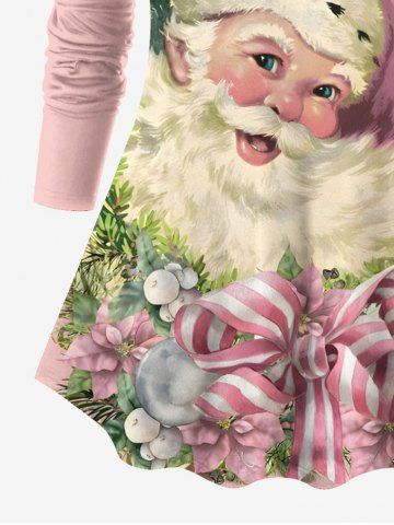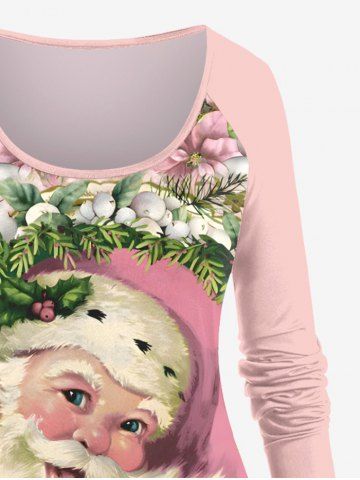 Plus Size Christmas Flower Leaf Santa Claus Bowknot Print Raglan Sleeve T-shirt - Light Pink - 5x