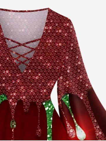 Plus Size Christmas Glitter Sparkling Paint Drop Sequins Print Lattice Long Sleeves T-shirt - Deep Red - 2x