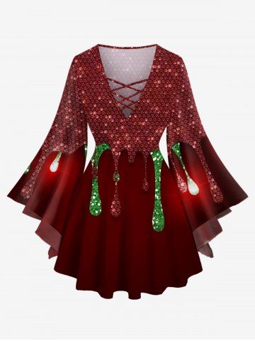 Plus Size Christmas Glitter Sparkling Paint Drop Sequins Print Lattice Long Sleeves T-shirt - Deep Red - 3x