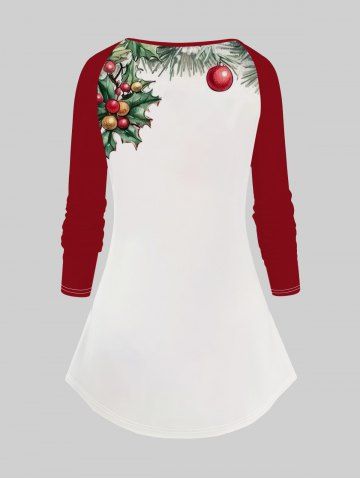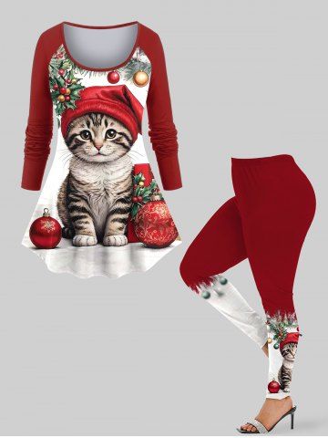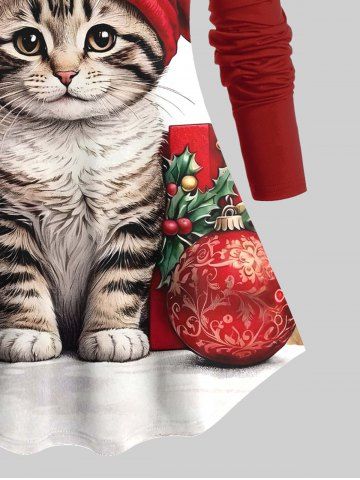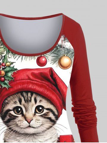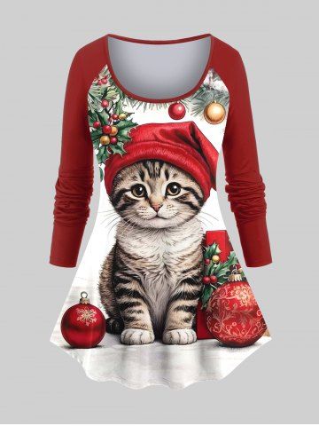 Plus Size Christmas Hat Ball Cat Holly Print Long Sleeves Women T-shirt - Red - L