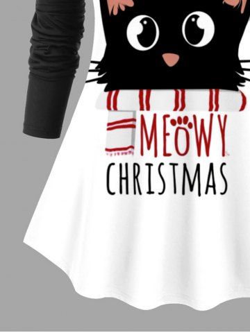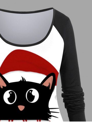 Plus Size Christmas Hat Cat Letters Print Long Sleeves T-shirt - Black - L