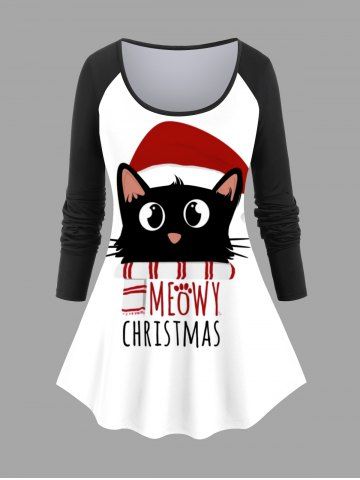 Plus Size Christmas Hat Cat Letters Print Long Sleeves T-shirt - Black - 5x